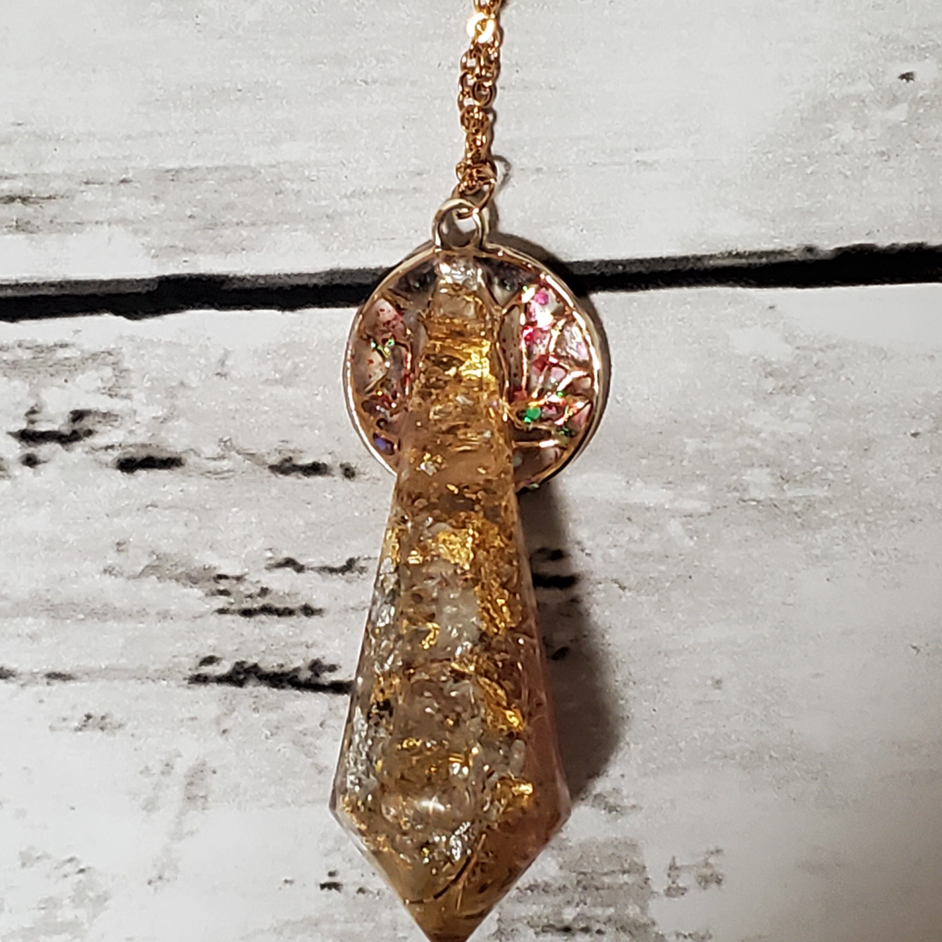 レジン(樹脂)で固めるので艶やかな見た目となり、中に金属と水晶などの鉱石を入れますのでキラキラした仕上がりです。