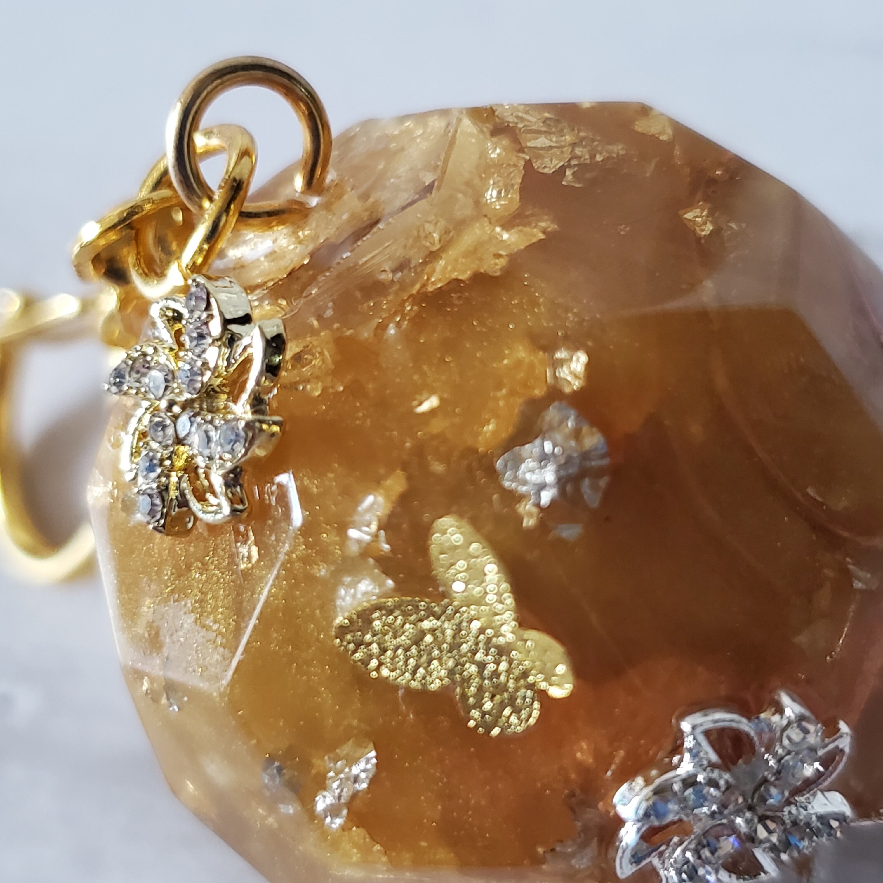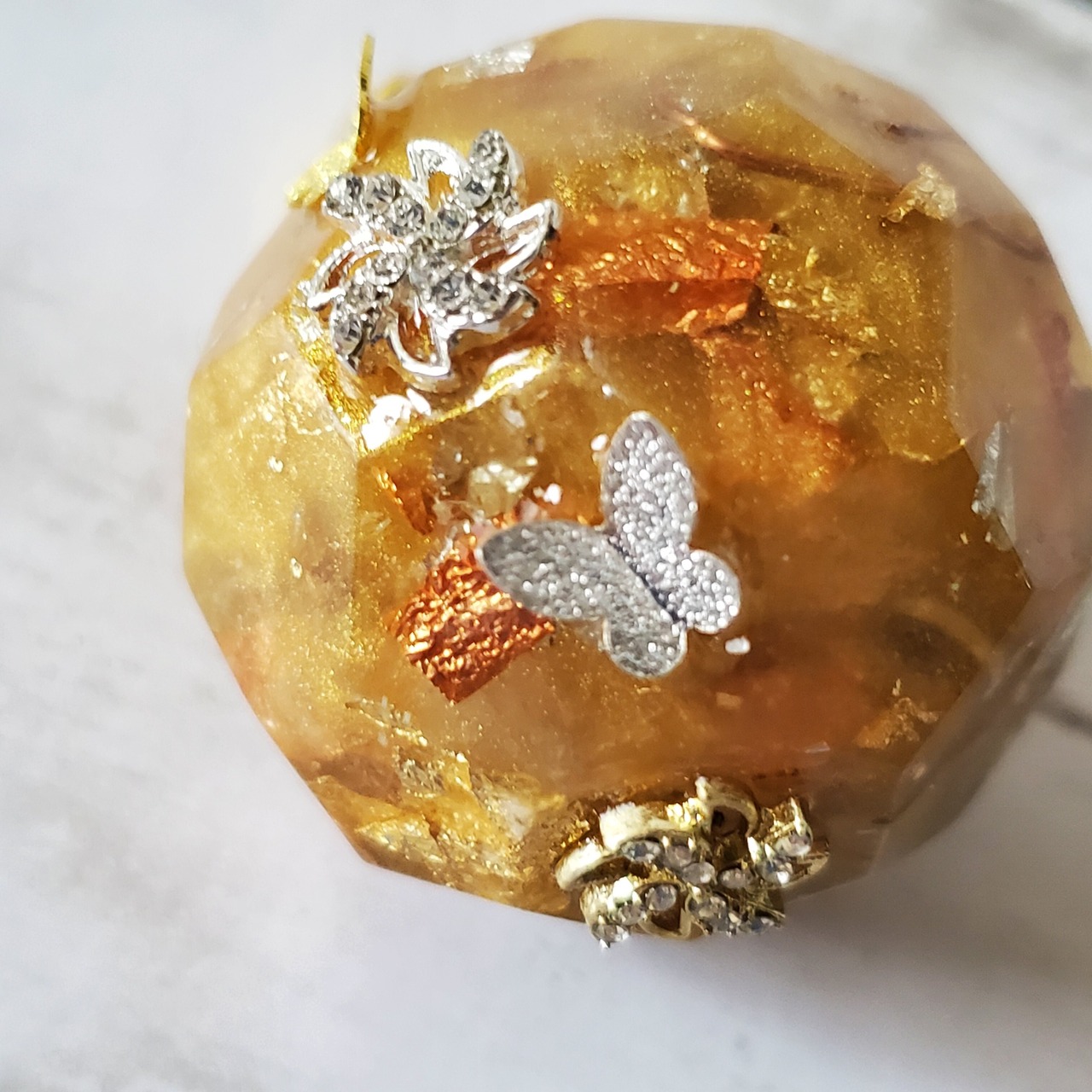 レジン(樹脂)で固めるので艶やかな見た目となり、中に金属と水晶などの鉱石を入れますのでキラキラした仕上がりです。