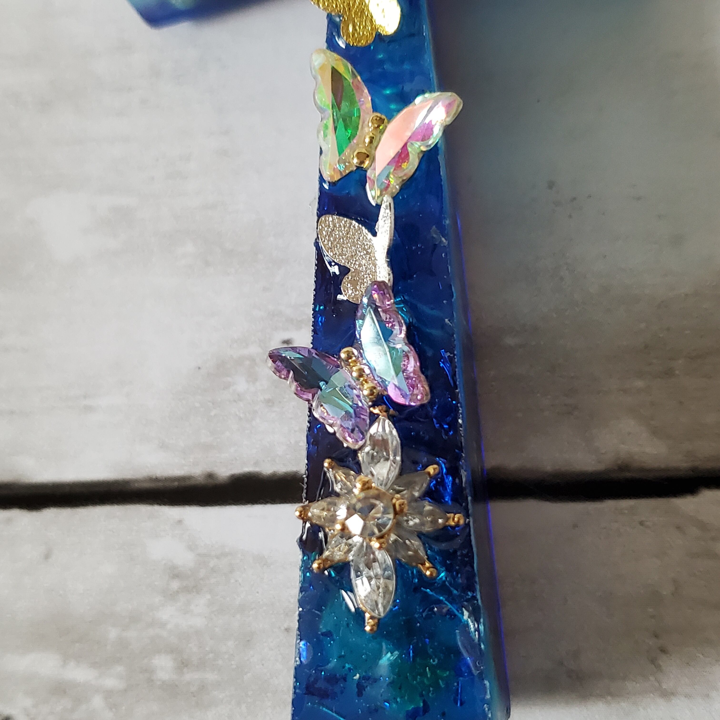 レジン(樹脂)で固めるので艶やかな見た目となり、中に金属と水晶などの鉱石を入れますのでキラキラした仕上がりです。