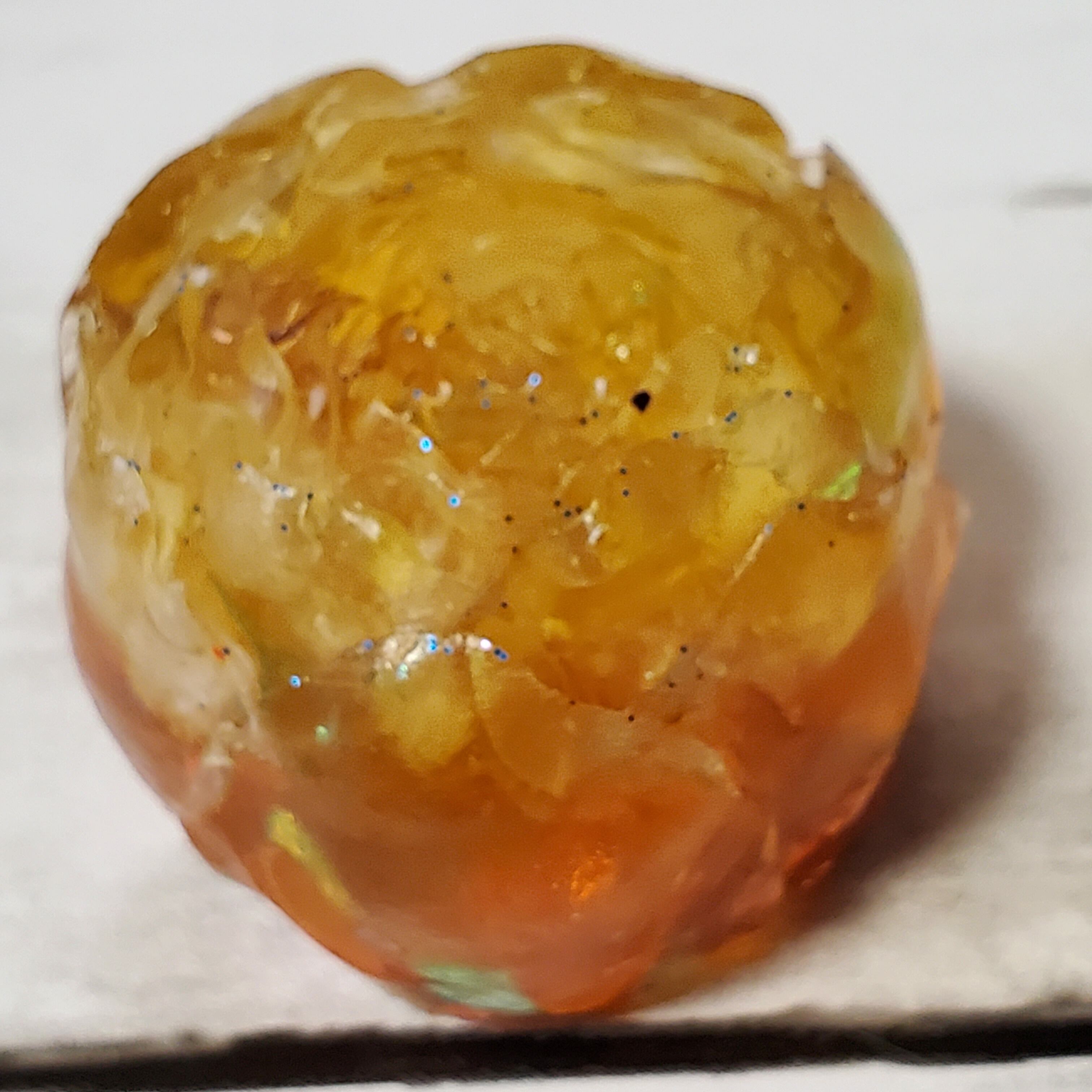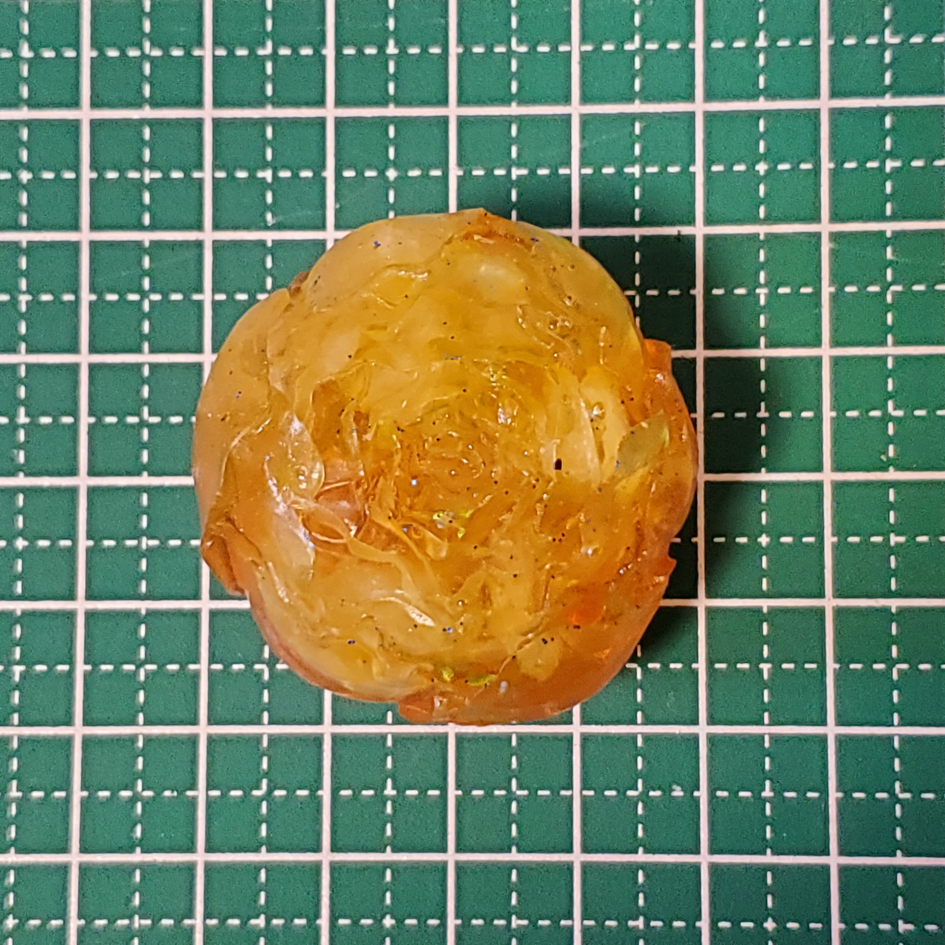 レジン(樹脂)で固めるので艶やかな見た目となり、中に金属と水晶などの鉱石を入れますのでキラキラした仕上がりです。