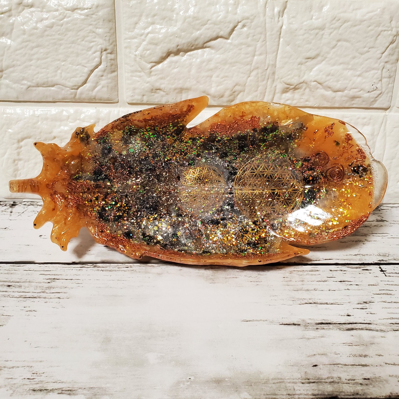 フラワーオブライフの入った 大きな羽のオルゴナイト皿