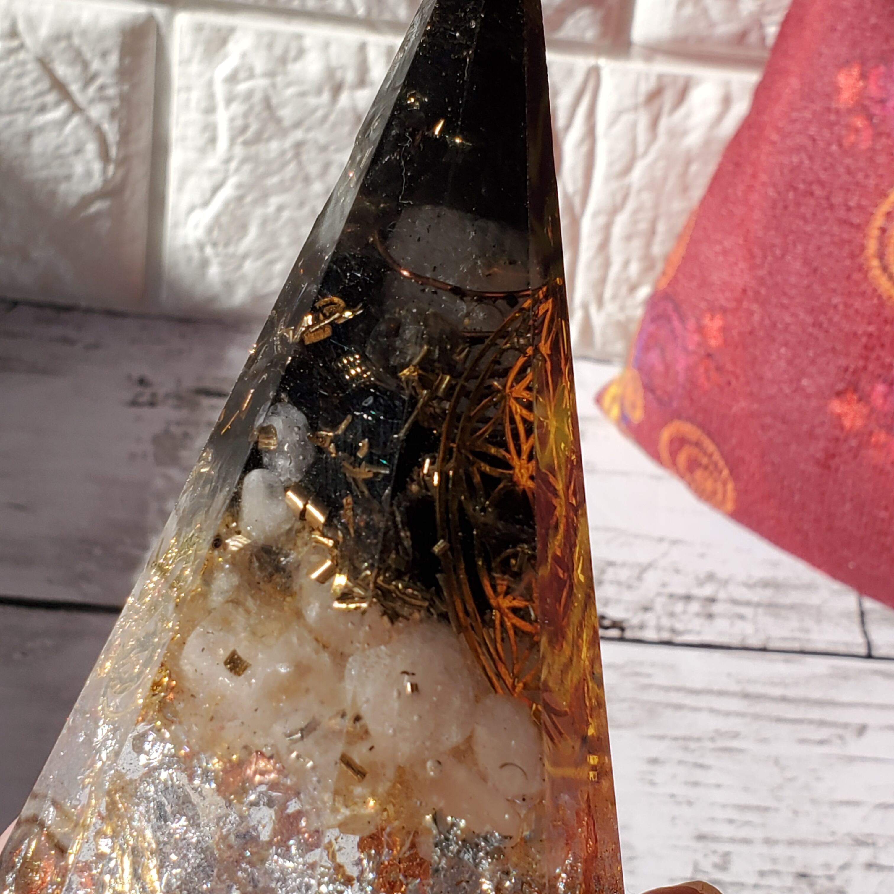 また、このオルゴナイトは八角錐形の形状にこだわって作られています。この形は、宇宙のエネルギーを集める力があり、ポジティブなエネルギーを身に纏う効果が期待できます。さらに、隕石の粉を使用することで、より強力なエネルギーを!意図しています