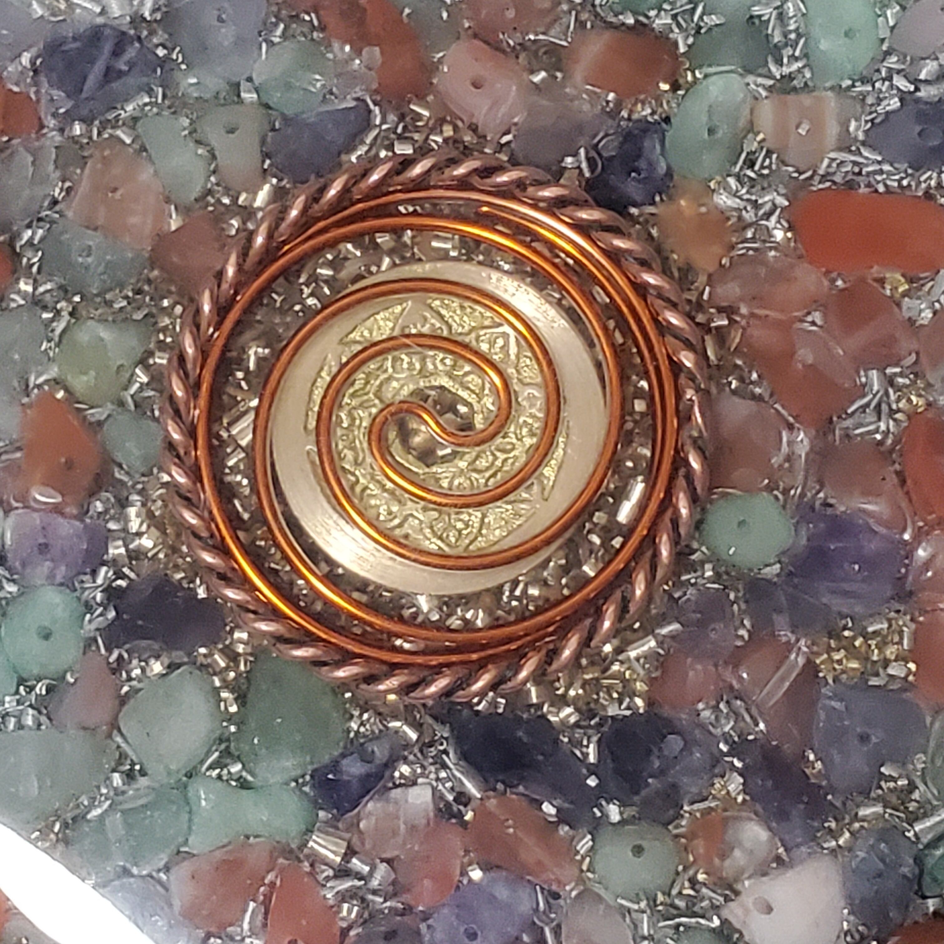 このオルゴナイトプレートは、テンソルリングとラッキーコインを中央に配置したオルゴナイトプレートト、有害なエネルギーを吸収し、ポジティブなエネルギーに変換する能力を持っていると言われています。あなたの身の回りのネガティブなエネルギーを浄化し、バランスを取り戻すお手伝いをします。