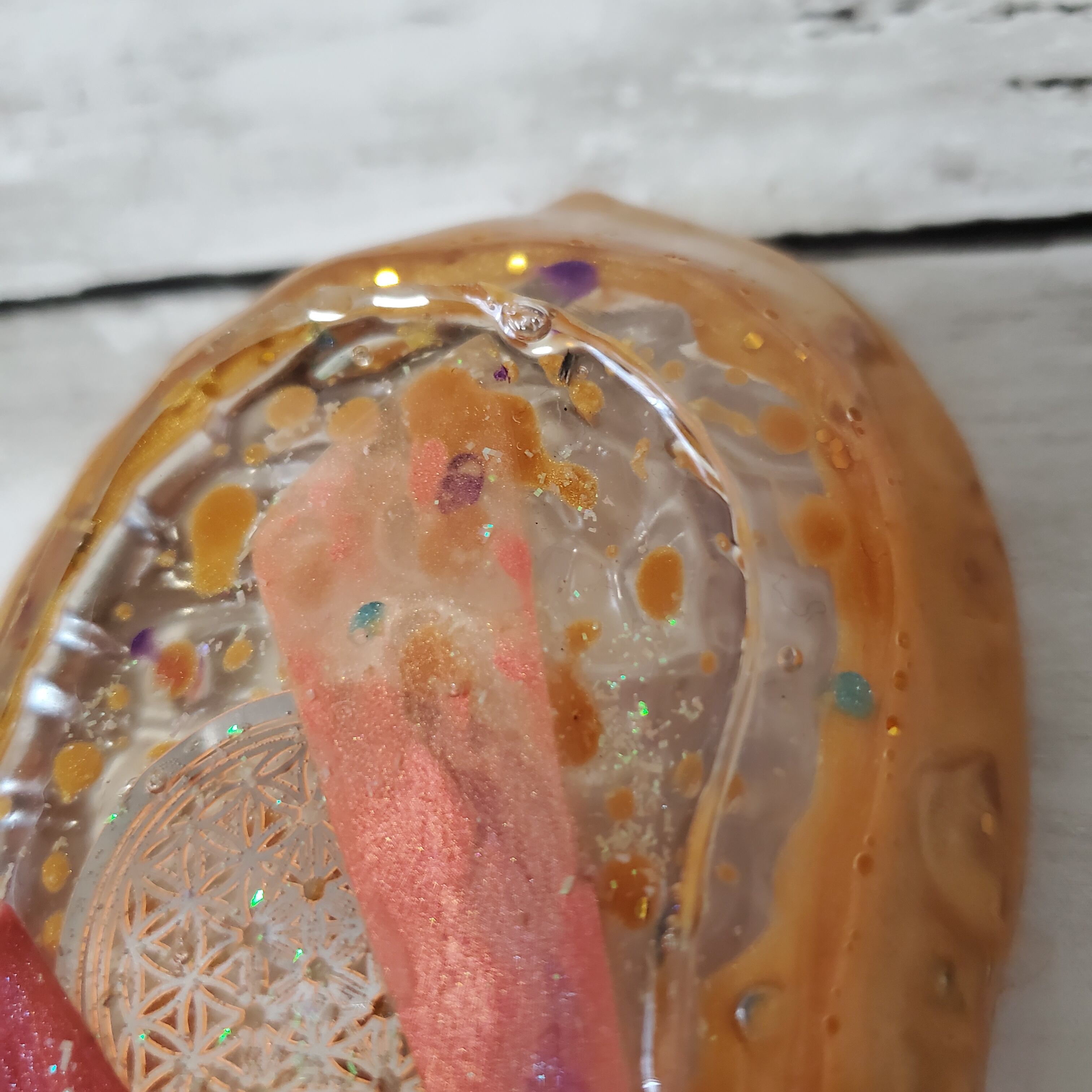 レジン(樹脂)で固めるので艶やかな見た目となり、中に金属と水晶などの鉱石を入れますのでキラキラした仕上がりです。